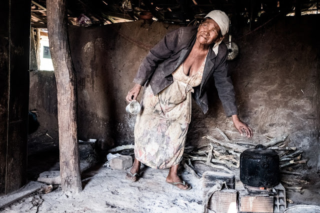 fogão a lenha é improvisado no meio da sala, o que deixa o local ainda mais
