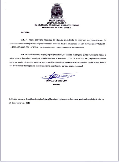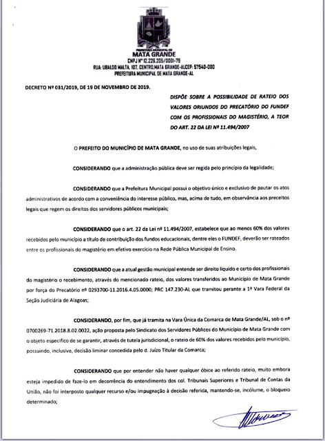 O Prefeito Mandu, que sempre foi aliado dos Servidores da Educação pela Partilha dos 60% do Fundef, assinou Decreto que pode, caso deferida a Liminar, liberar os recursos para serem rateados. Motivo de sobra para acreditar na vitória da classe, na conquista do melhor para a nossa gente! O Prefeito se mostra otimista e convicto de que será portador desta boa noticia esperada por todos!