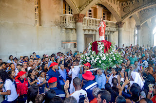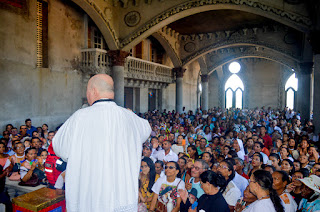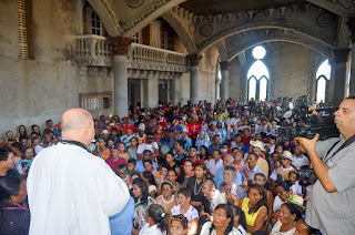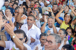 evento contou com um helicóptero que jogou rosas e água benta para as pessoas.